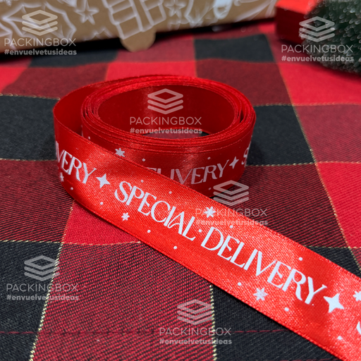 Listón Satinado diseƱo estĆ”ndar. CaracterĆsticas: 1 pulgada (2.54 cm) DiseƱo estĆ”ndar Navidad Special Delivery Tinta blancaĀ